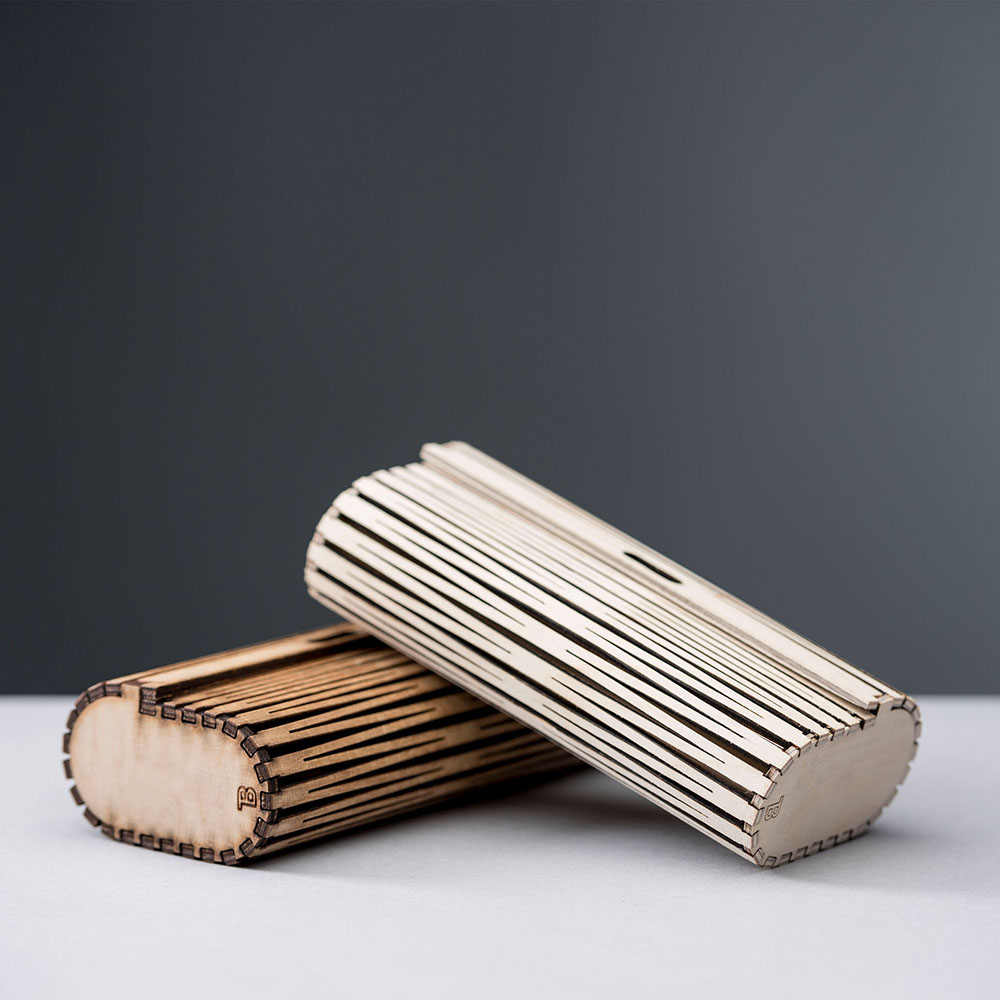 Glasses case made of wood, manufactured by the laser cutter. The fine incisions make the wood bendable.